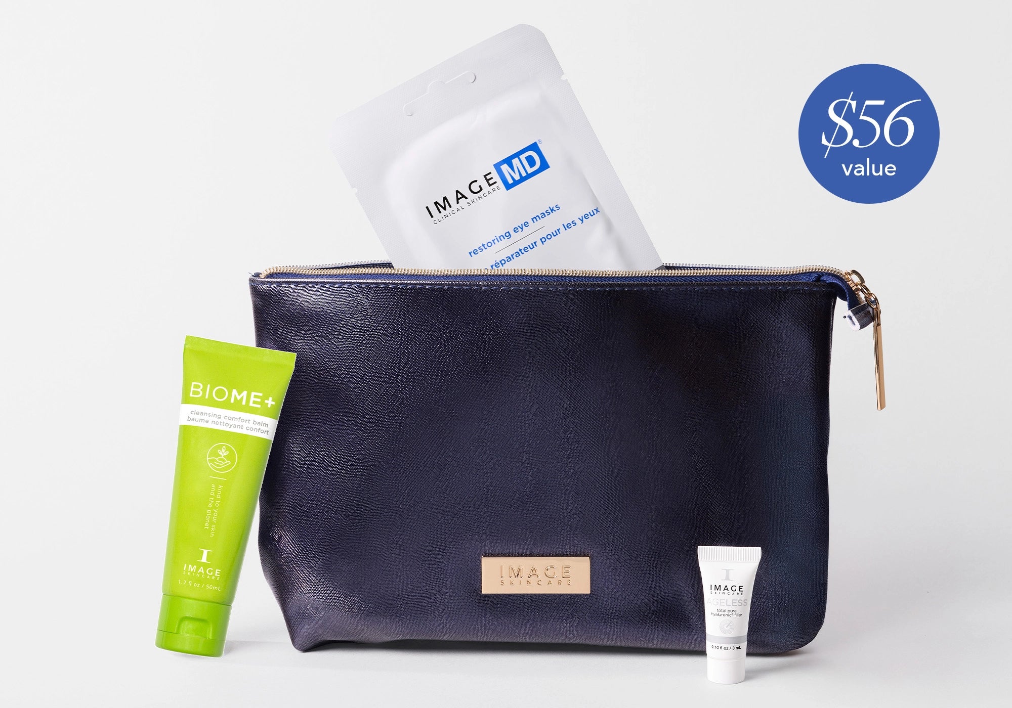 Includes an IMAGE cosmetic bag, travel-size BIOME+ cleansing balm, MD eye mask, and an AGELESS pure hyaluronic⁶ filler sample.